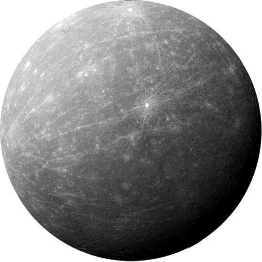 Merkur, der kleinste Planet in unserem Sonnensystem und der Sonne am nächsten, ist nur geringfügig größer als der Erdmond. Merkur ist der schnellste Planet und fliegt alle 88 Erdentage um die Sonne.